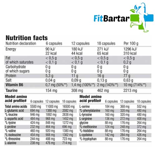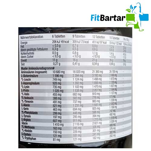 | کل آمینواسیدها | 1800 mg | 9000 mg |